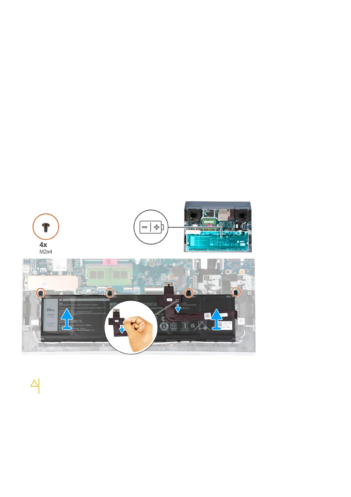 2. Remove the four screws (M2x4) that secure the battery to the palm-rest and keyboard assembly.