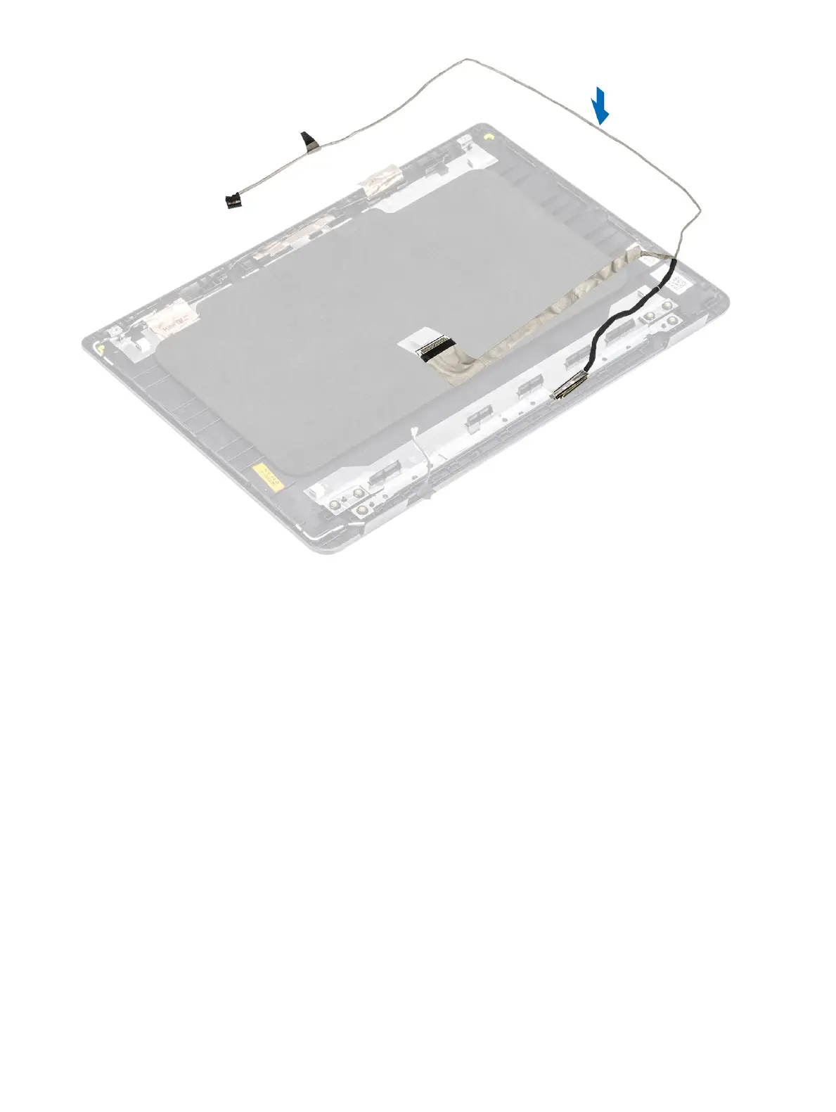 2 Route the display cable and camera cable through the routing guides on the display back-cover and antenna assembly [1,2].