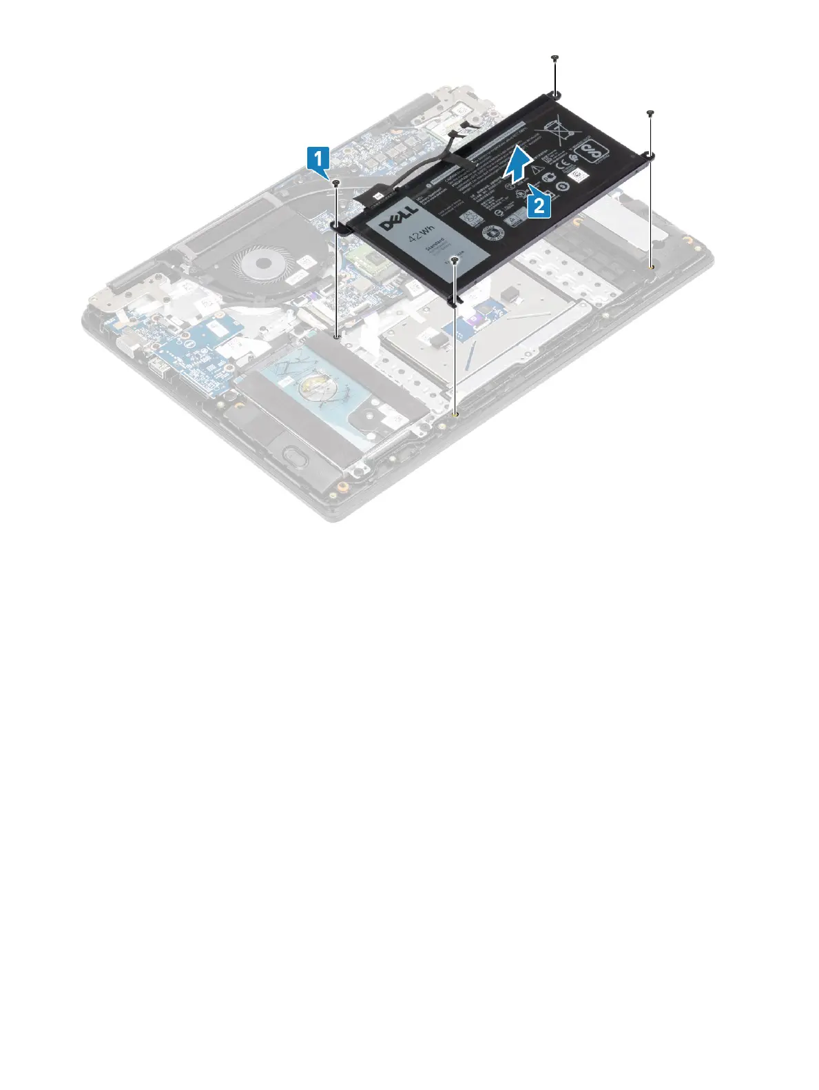 2 Replace the four (M2x3) screws that secure the battery to the palmrest and keyboard assembly [2].
