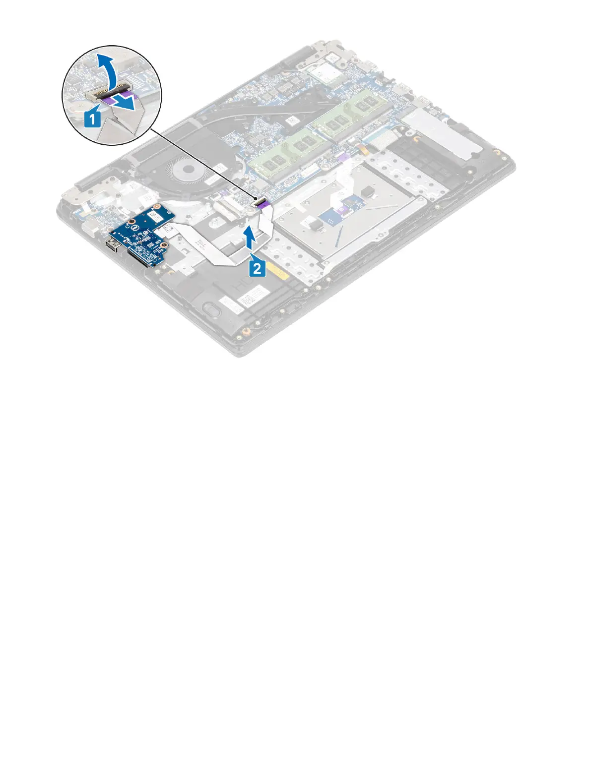 4 Lift the I/O board, along with the cable, o the palm rest and keyboard assembly [2].