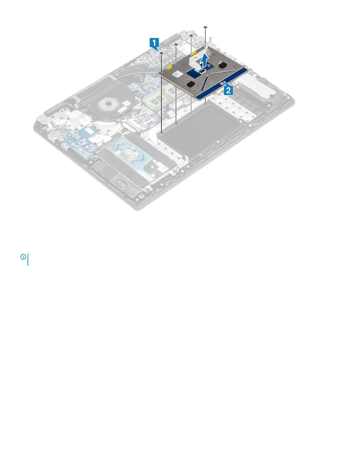 2 Replace the four (M2x2) screws that secure the touch pad to the palmrest and keyboard assembly [2].