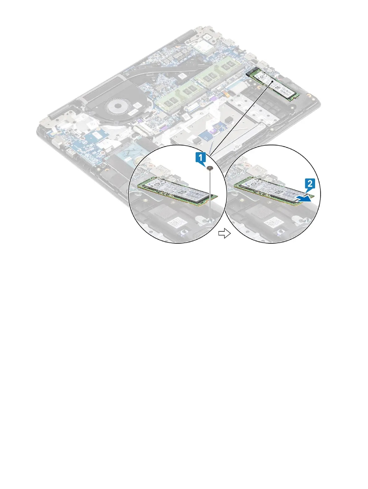 2 Replace the single (M2x2) screw that secures the solid-state drive/Intel Optane card to the palmrest and keyboard assembly [2].