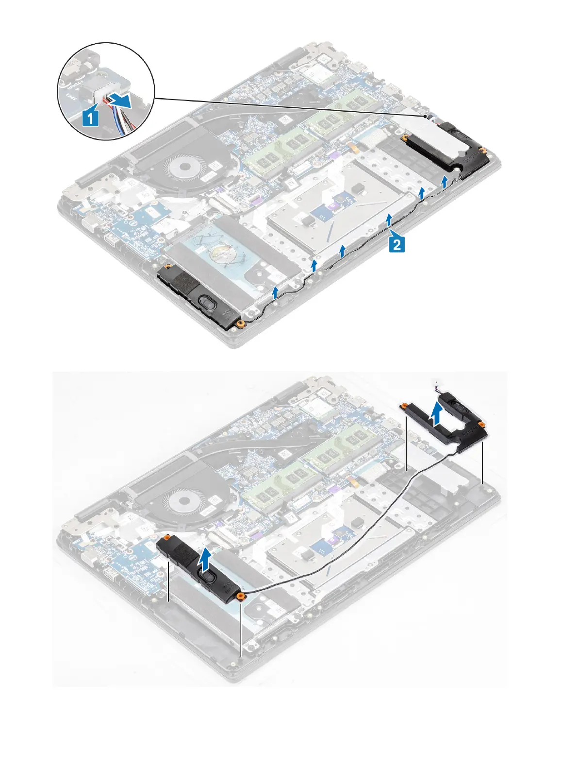 3 Lift the speakers, along with the cable, o the palm rest and keyboard assembly.