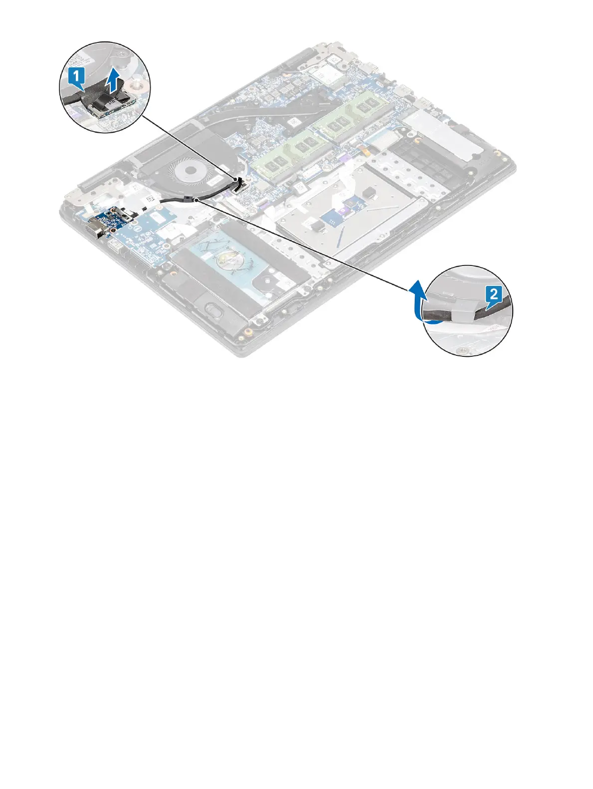 3 Remove the two (M2x3) screws that secure the VGA daughterboard to the palmrest and keyboard assembly [1].