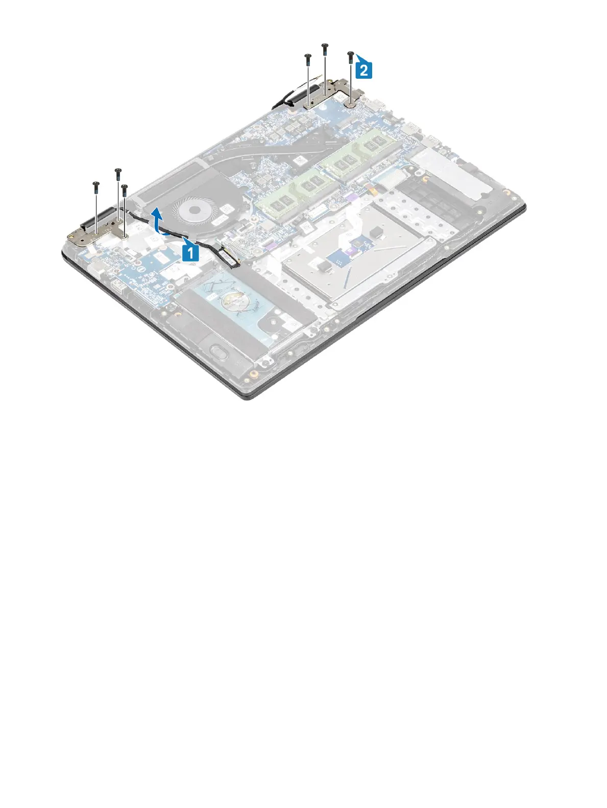 6 Lift the hinges to release the palmrest and keyboard assembly o the display assembly [2].