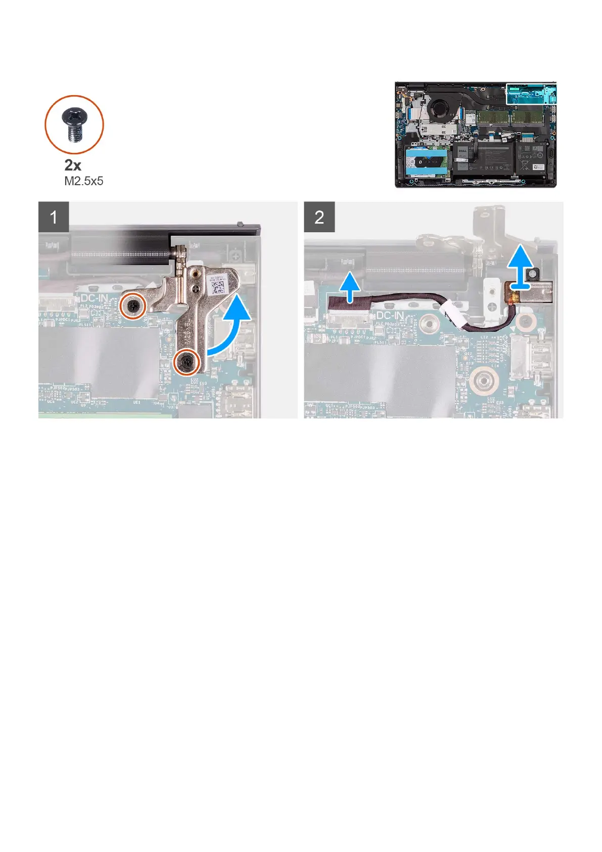 1. Remove the two (M2.5x5) screws that secure the right hinge to the palm-rest and keyboard assembly.