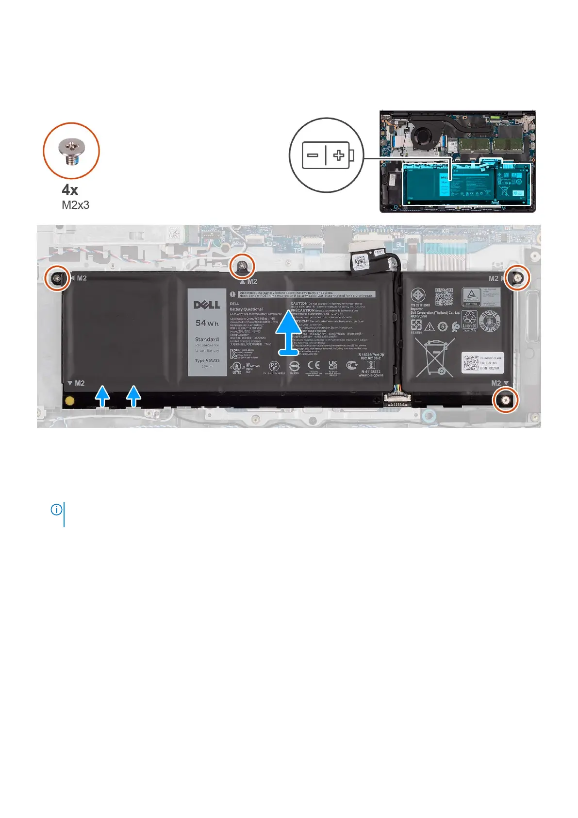 2. Remove the four (M2x3) screws that secure the battery to the palm-rest and keyboard assembly.