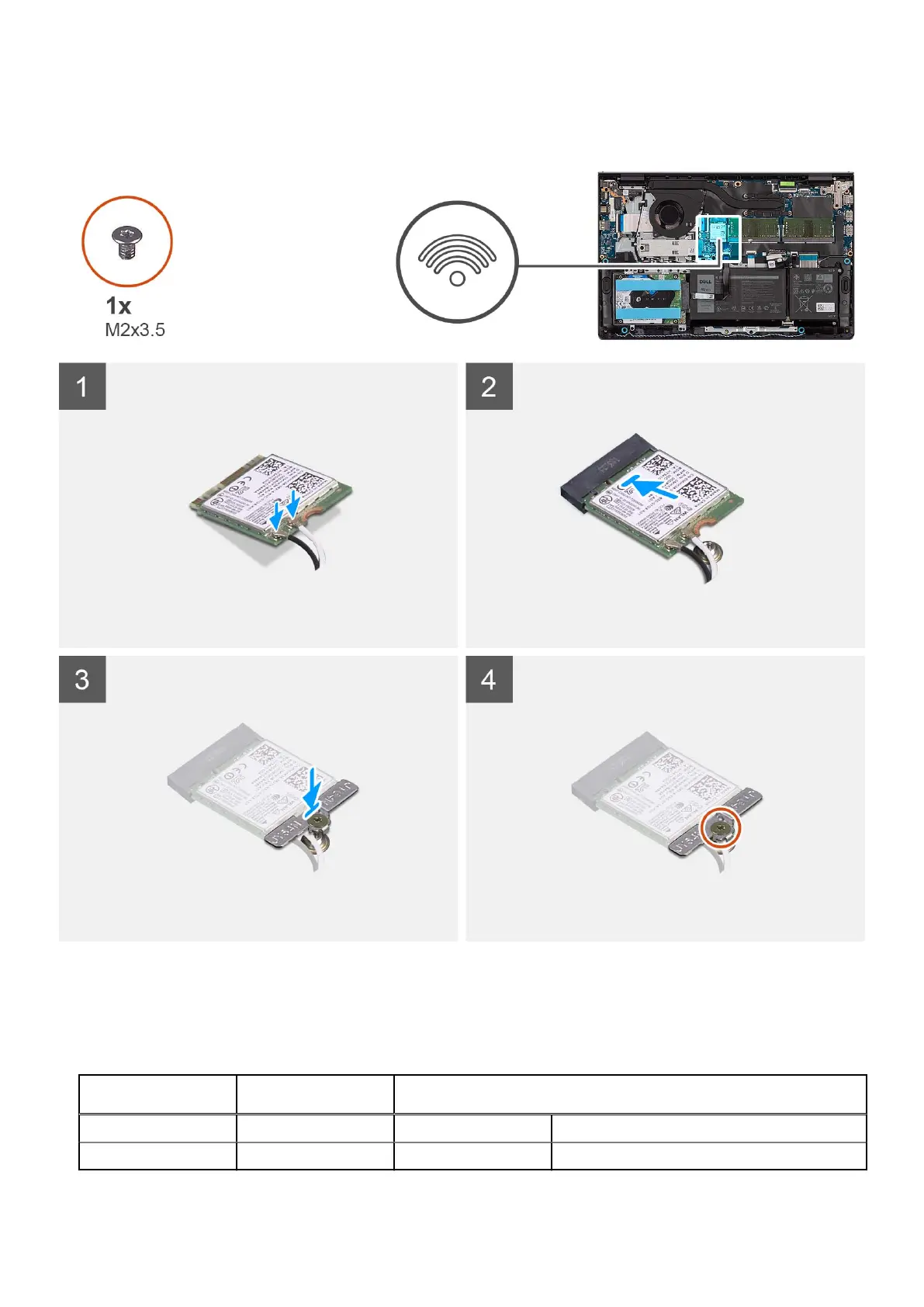 The following table provides the antenna-cable color scheme for the wireless card supported by your computer.