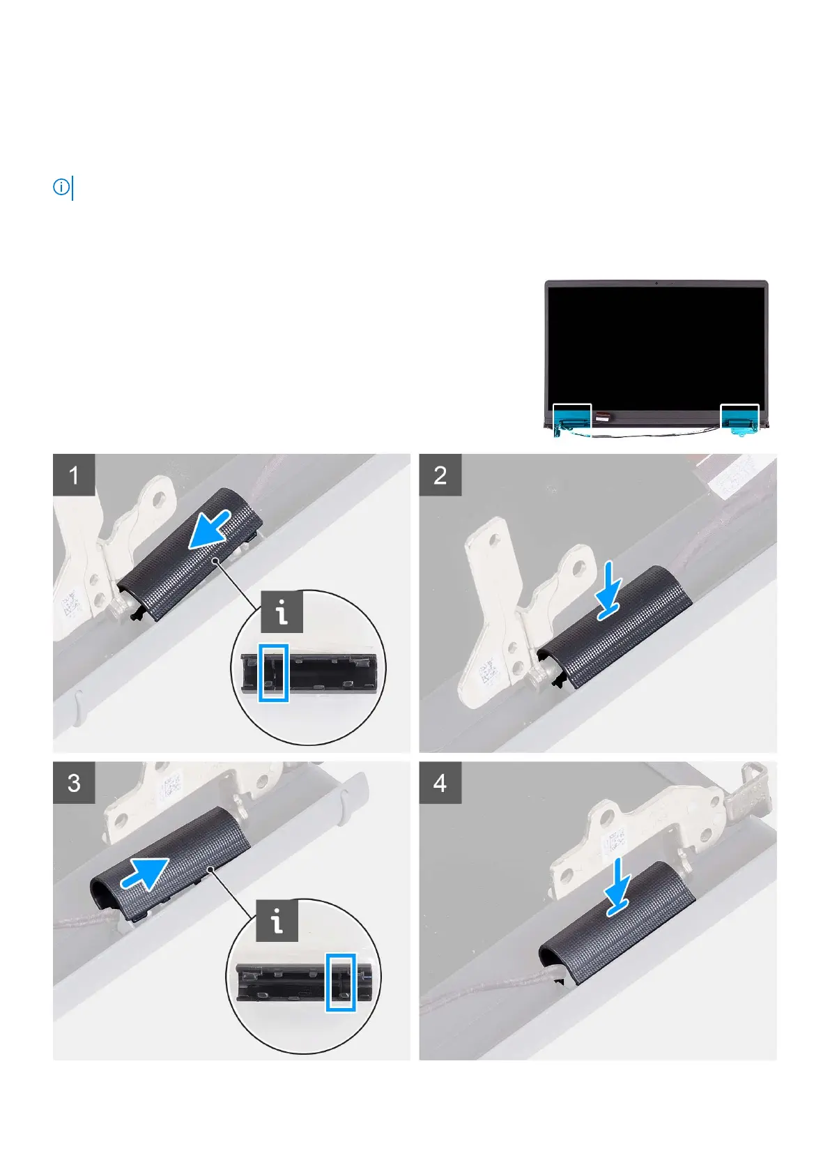The following images indicate the location of the hinge caps and provide a visual representation of the installation procedure.
