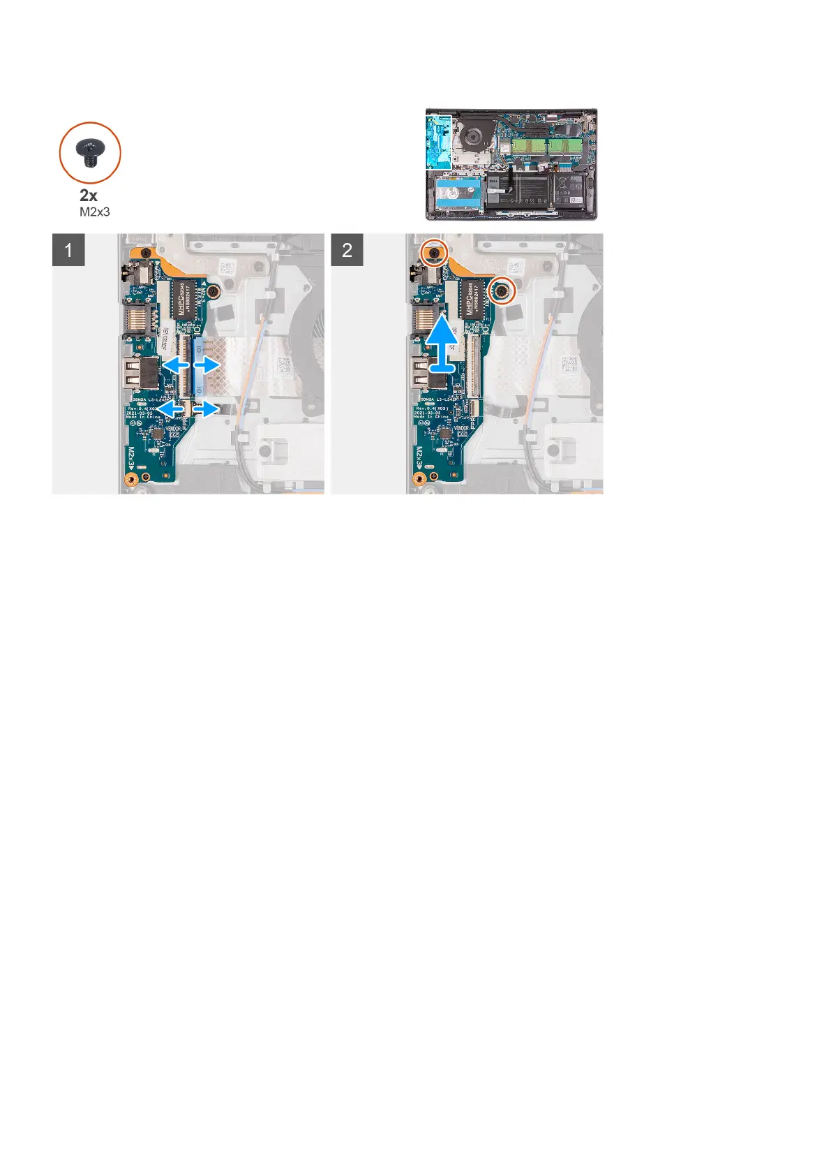 3. Remove the two (M2x3) screws that secure the I/O board to the palm-rest and keyboard assembly, and remove the I/O