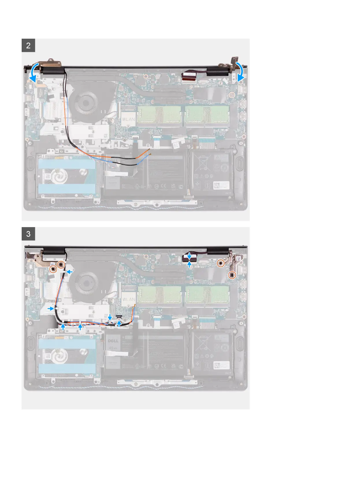 2. Fold the hinges back and install the four (M2.5x5) screws to secure the display assembly.