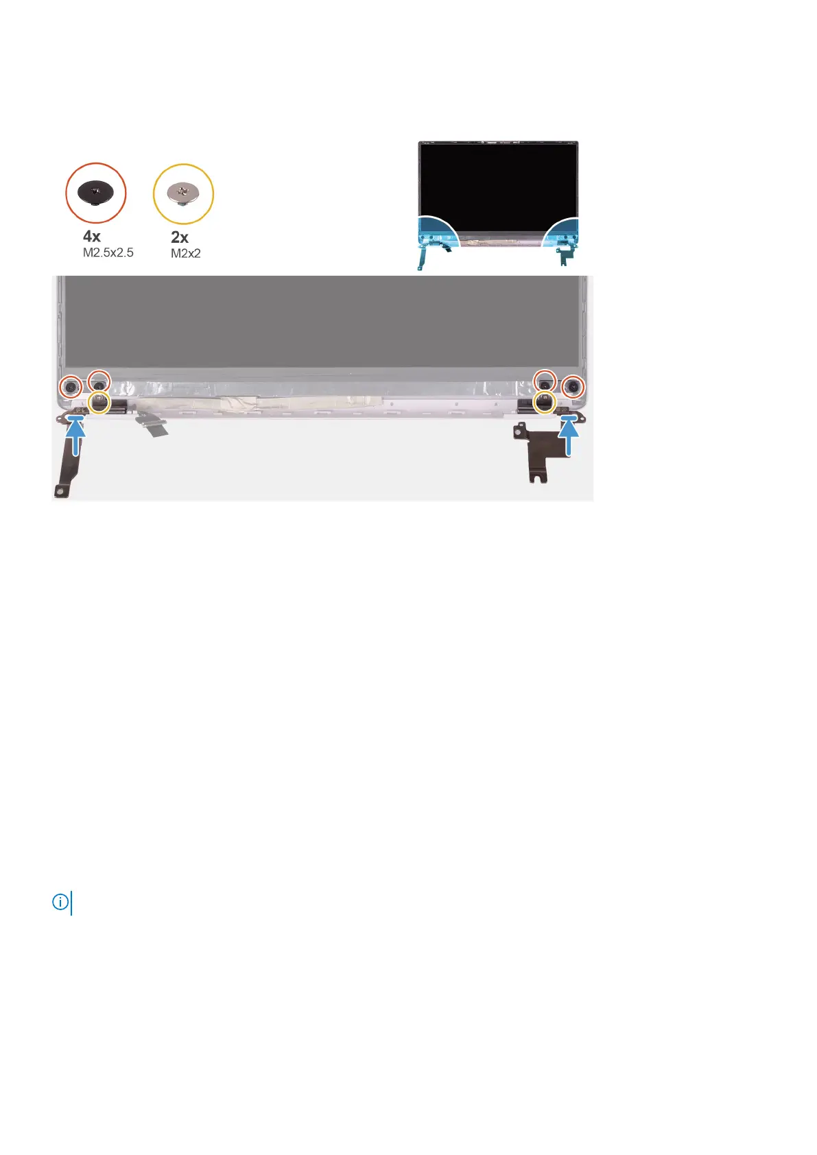 3. Replace the four (M2.5x2.5) screws to secure the display hinges to the display back-cover.