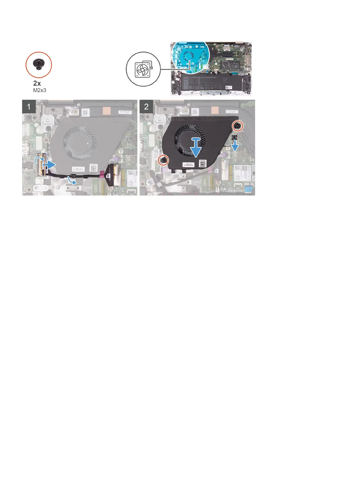 4. Remove the two screws (M2x3) that secure the fan to the system board.
