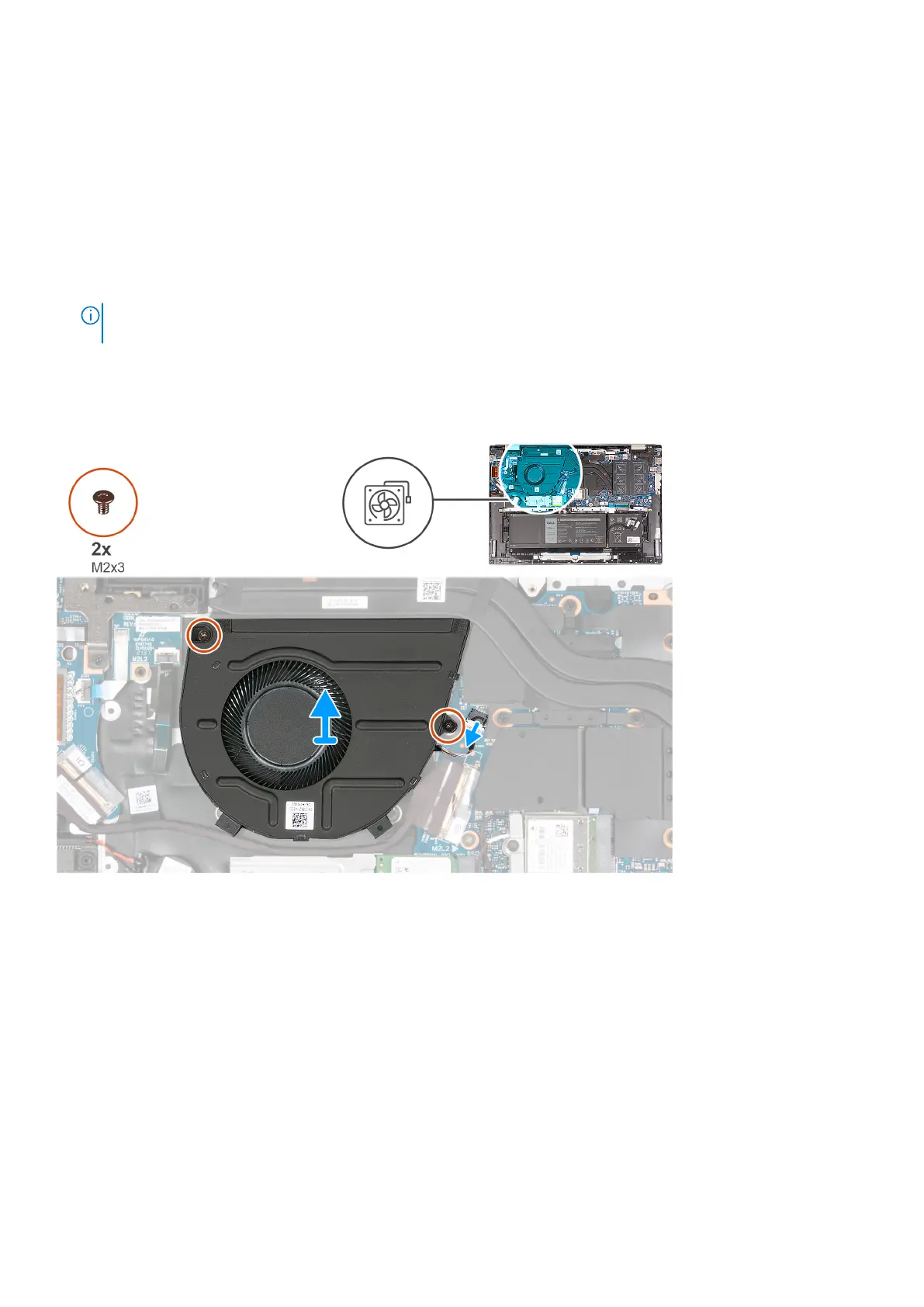 2. Remove the two screws (M2x3) that secure the fan to the palm-rest and keyboard assembly.