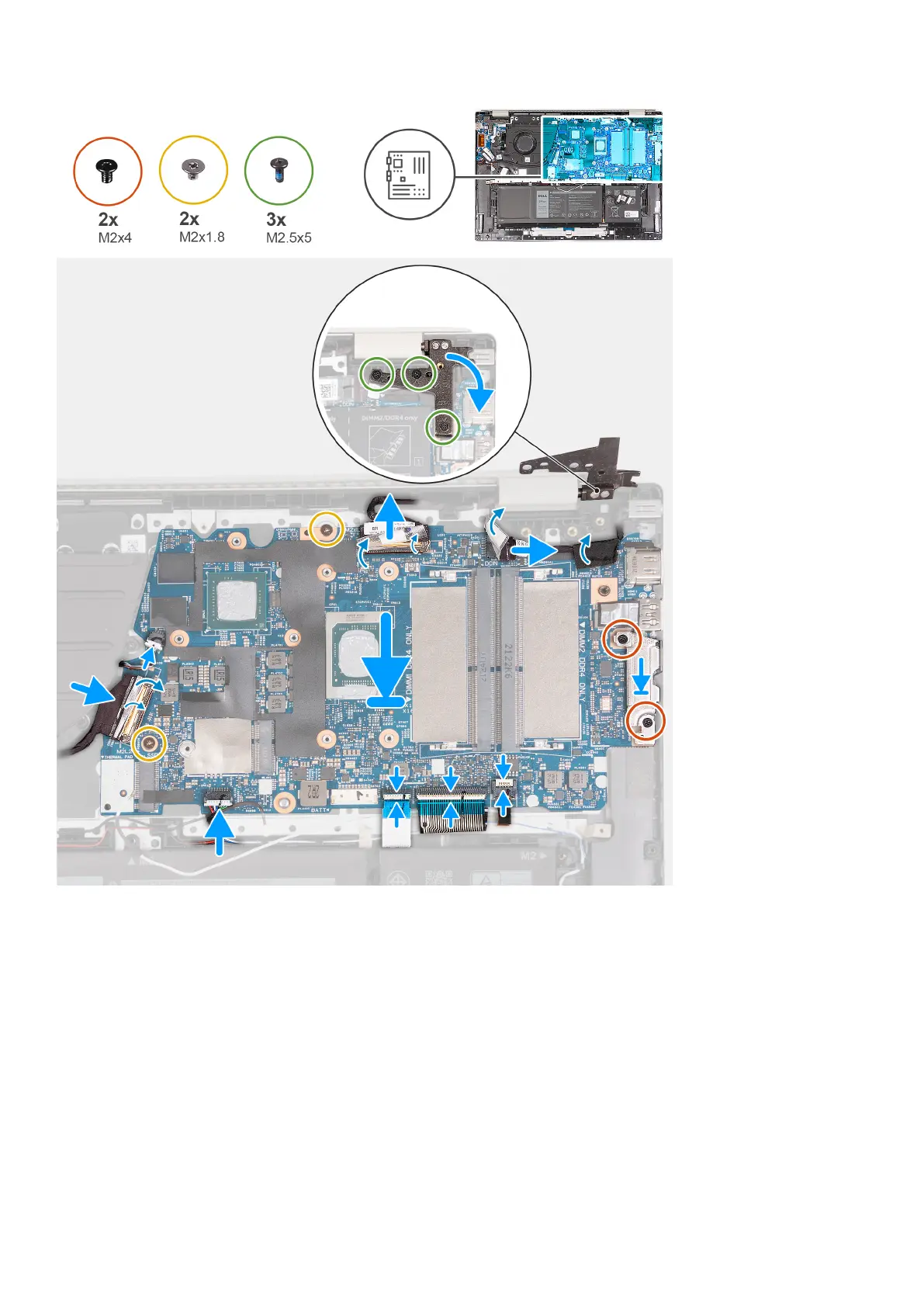 4. Replace the two screws (M2x1.8) that secure the system board to the palm-rest and keyboard assembly.