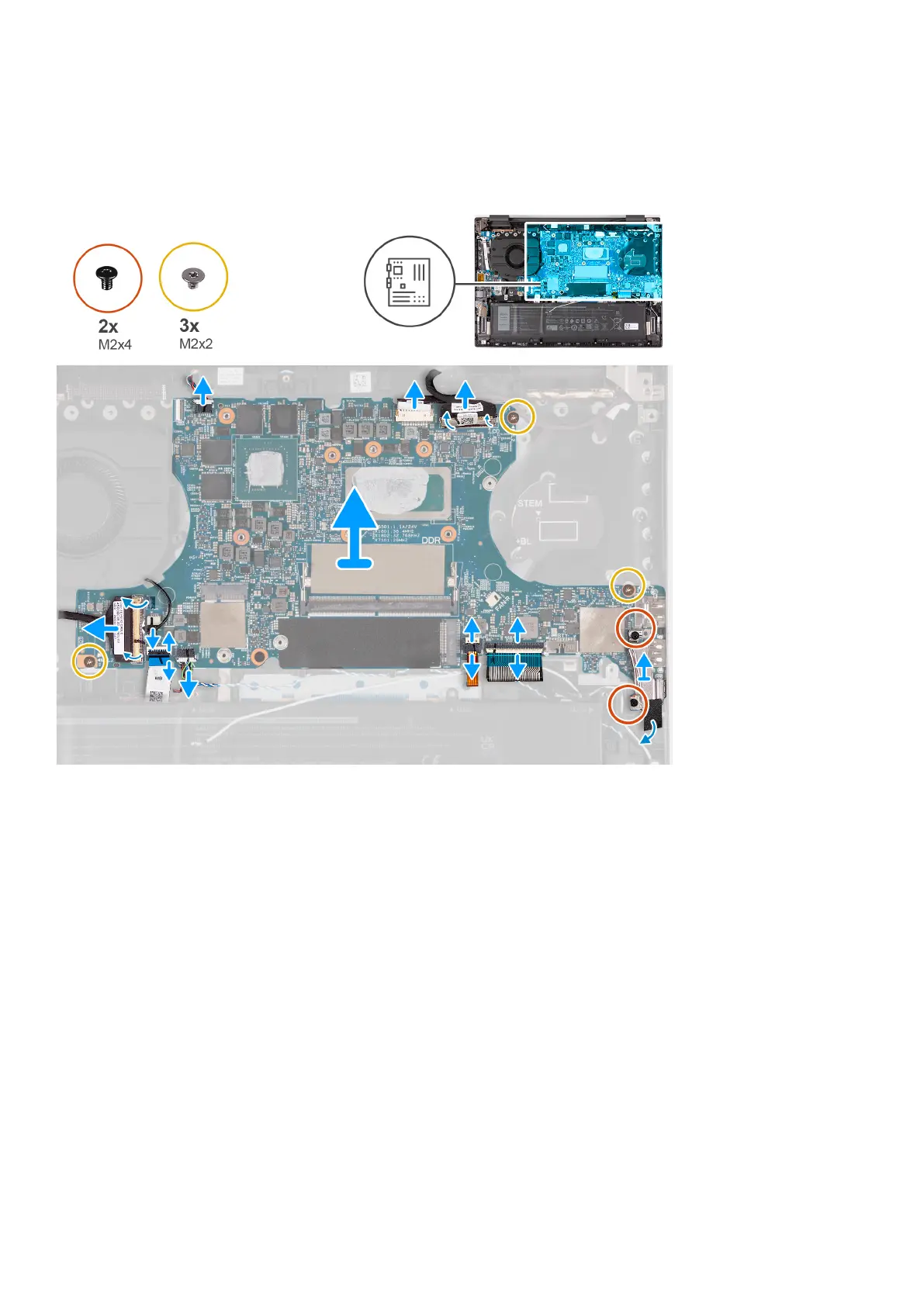 16. Remove the three screws (M2x2) that secure the system board to the palm-rest and keyboard assembly.
