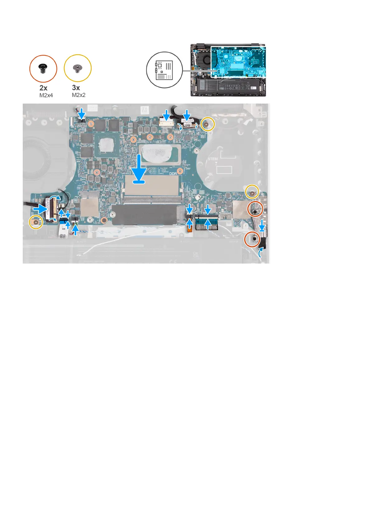 4. Replace the three screws (M2x2) that secure the system board to the palm-rest and keyboard assembly.