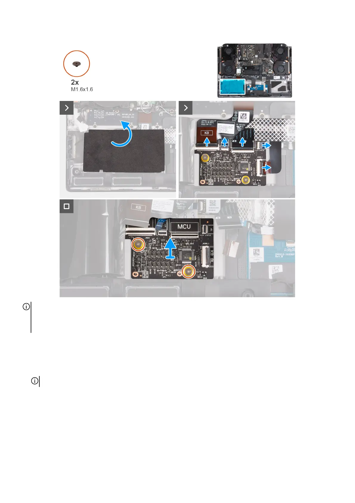 7. Remove the two screws (M1.6x1.6) that secure the keyboard-controller board to the palm-rest and keyboard assembly.
