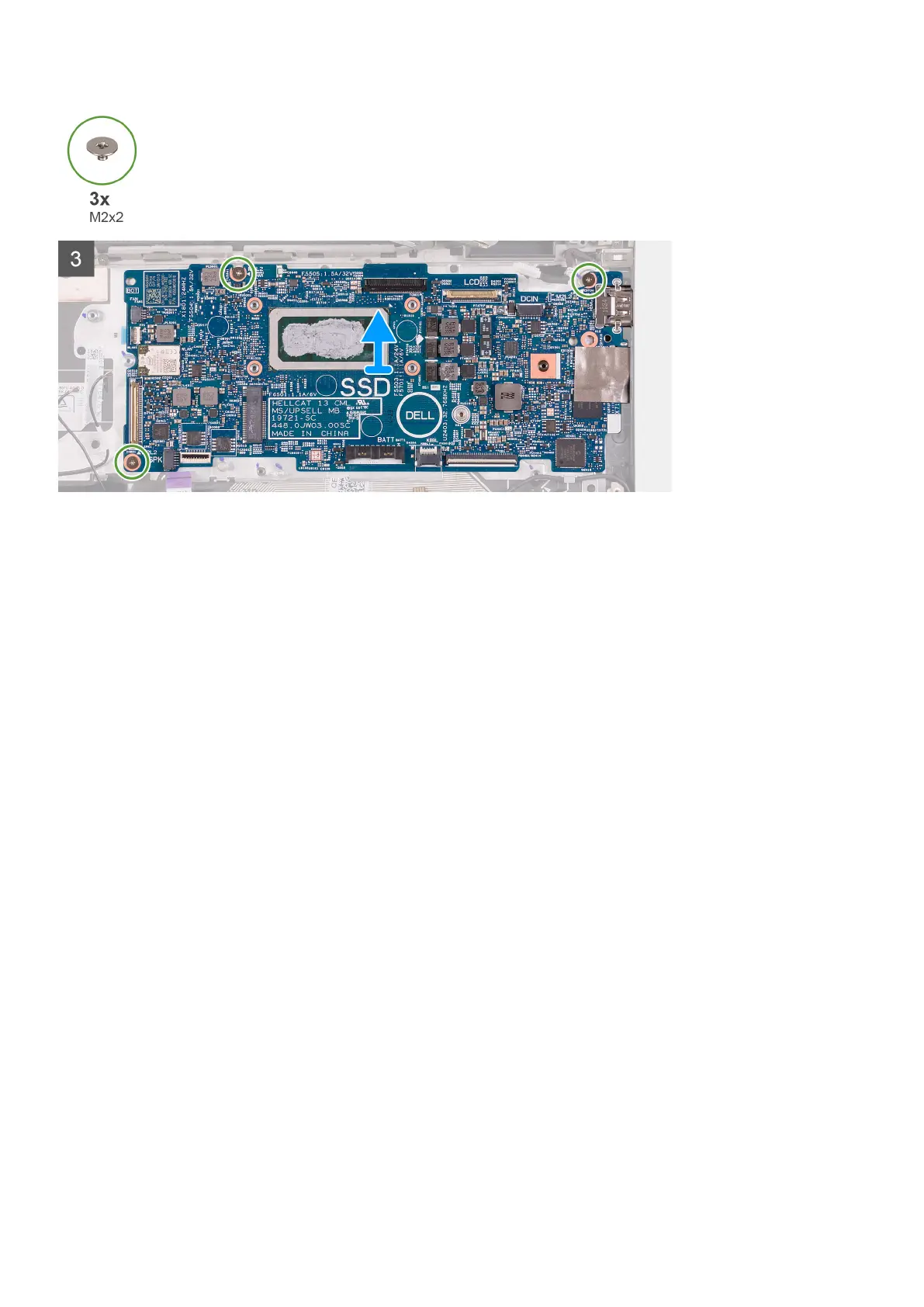 19. Remove the three screws (M2x2) that secure the system board to the palm-rest assembly.