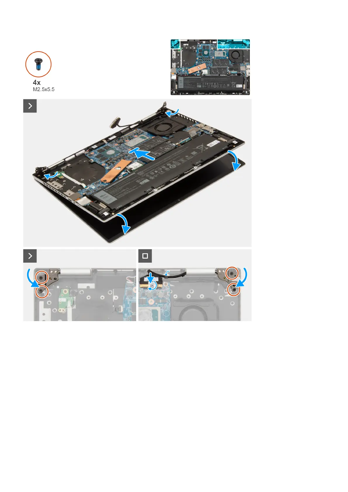 6. Replace the two screws (M2.5x5.5) that secure the right display-assembly hinge to the palm-rest and keyboard assembly.