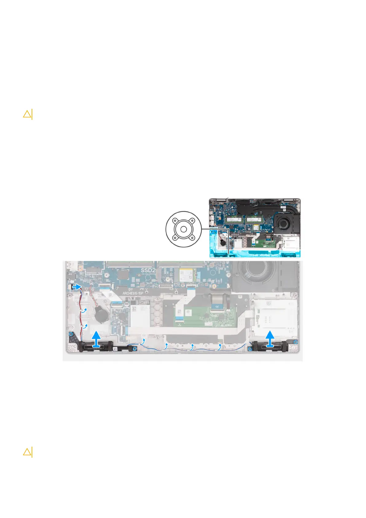 2. Remove the speaker cables from the routing guides on the palm-rest assembly.
