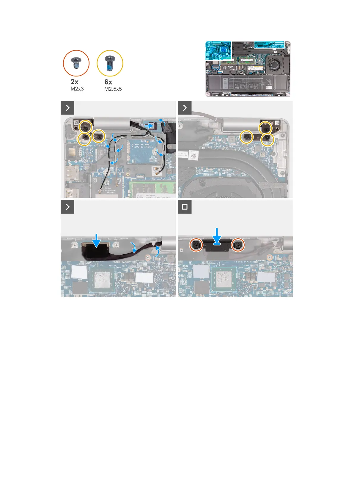 10. Replace the two (M2x3) screws that secure the display cable bracket to the system board.