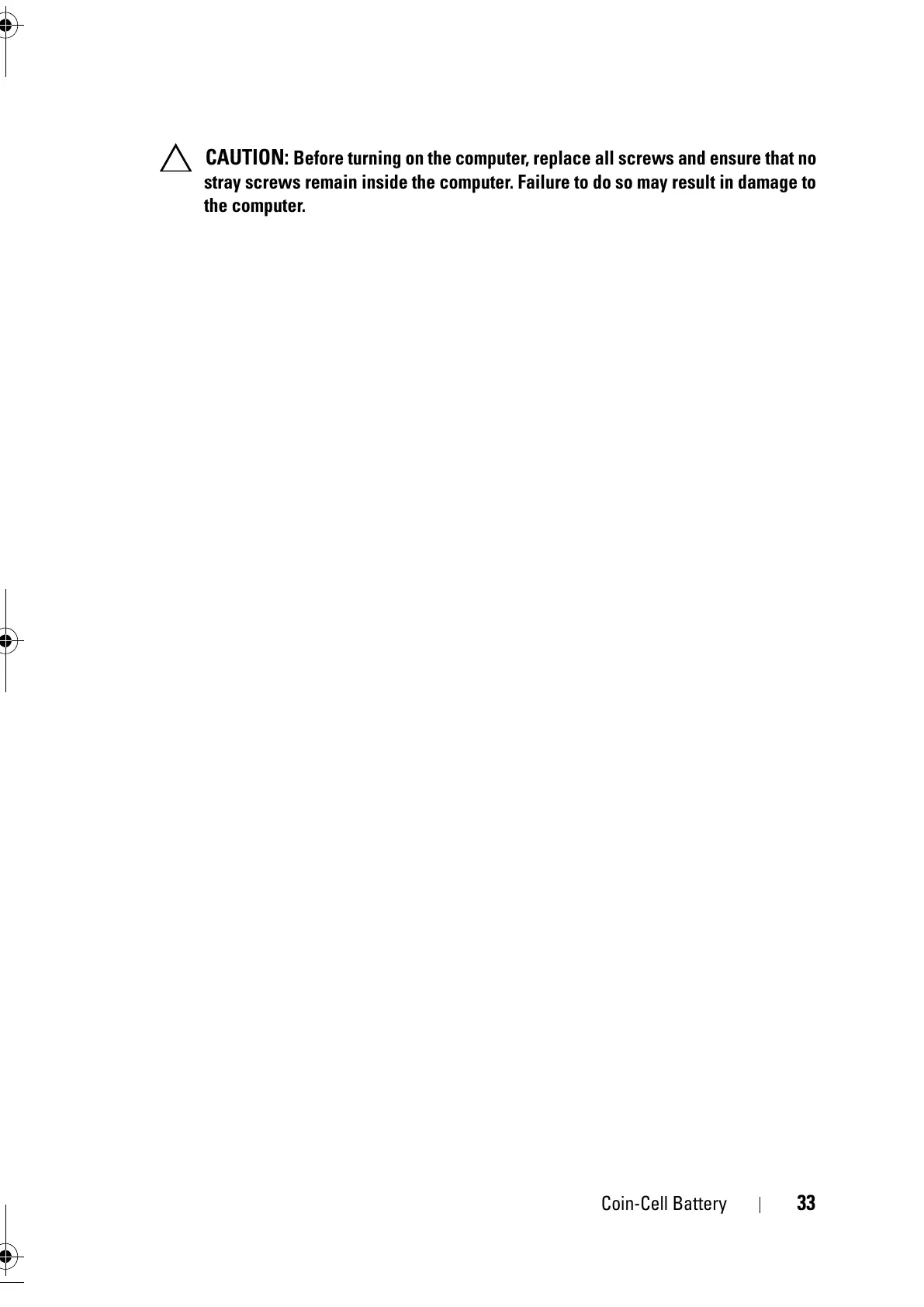 CAUTION: Before turning on the computer, replace all screws and ensure that no