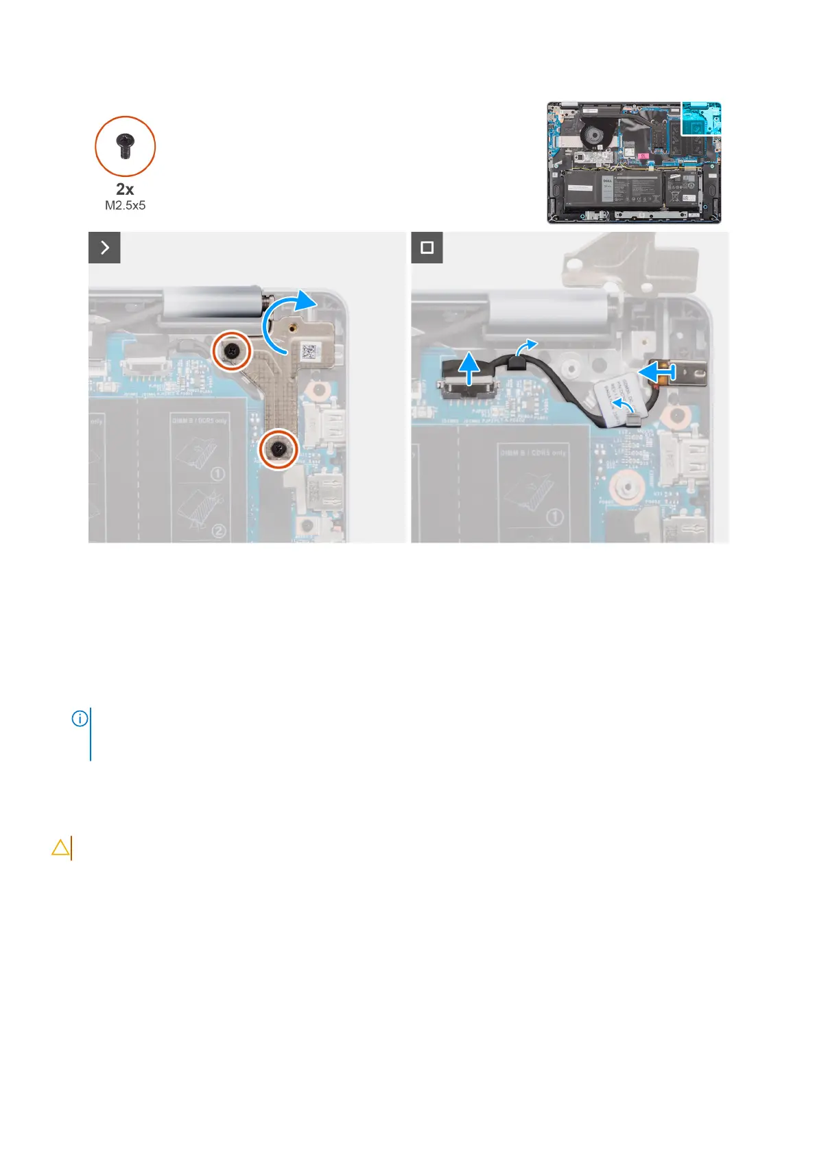 1. Remove the two screws (M2.5x5) that secure the hinge to the system board and the palm-rest and keyboard assembly.