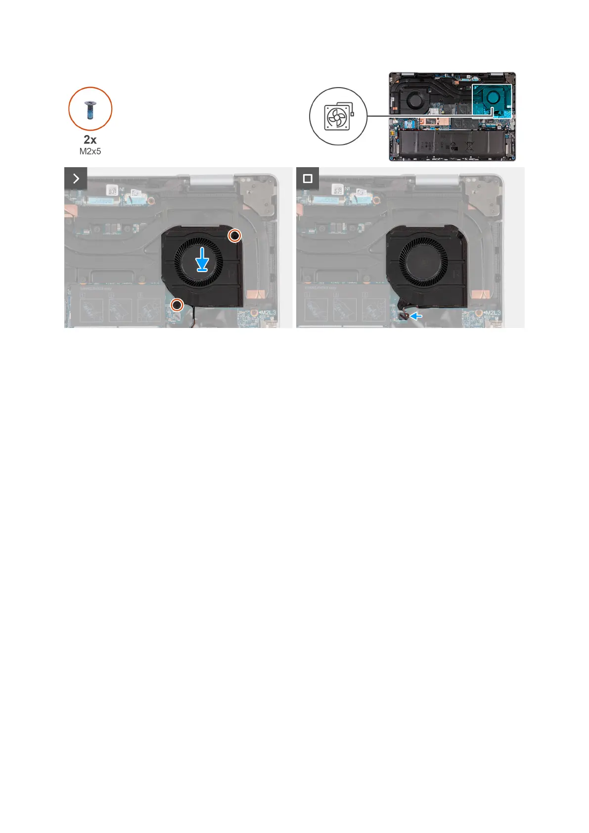 3. Replace the two screws (M2x5) that secure the processor fan to the palm-rest and keyboard assembly.