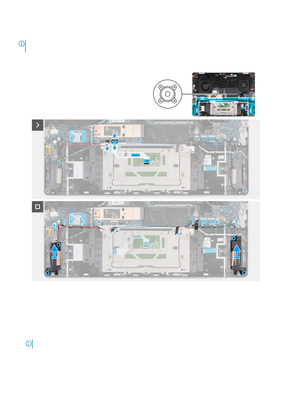 4. Remove the down-firing speaker cables from their routing guides on the palm-rest and keyboard assembly.