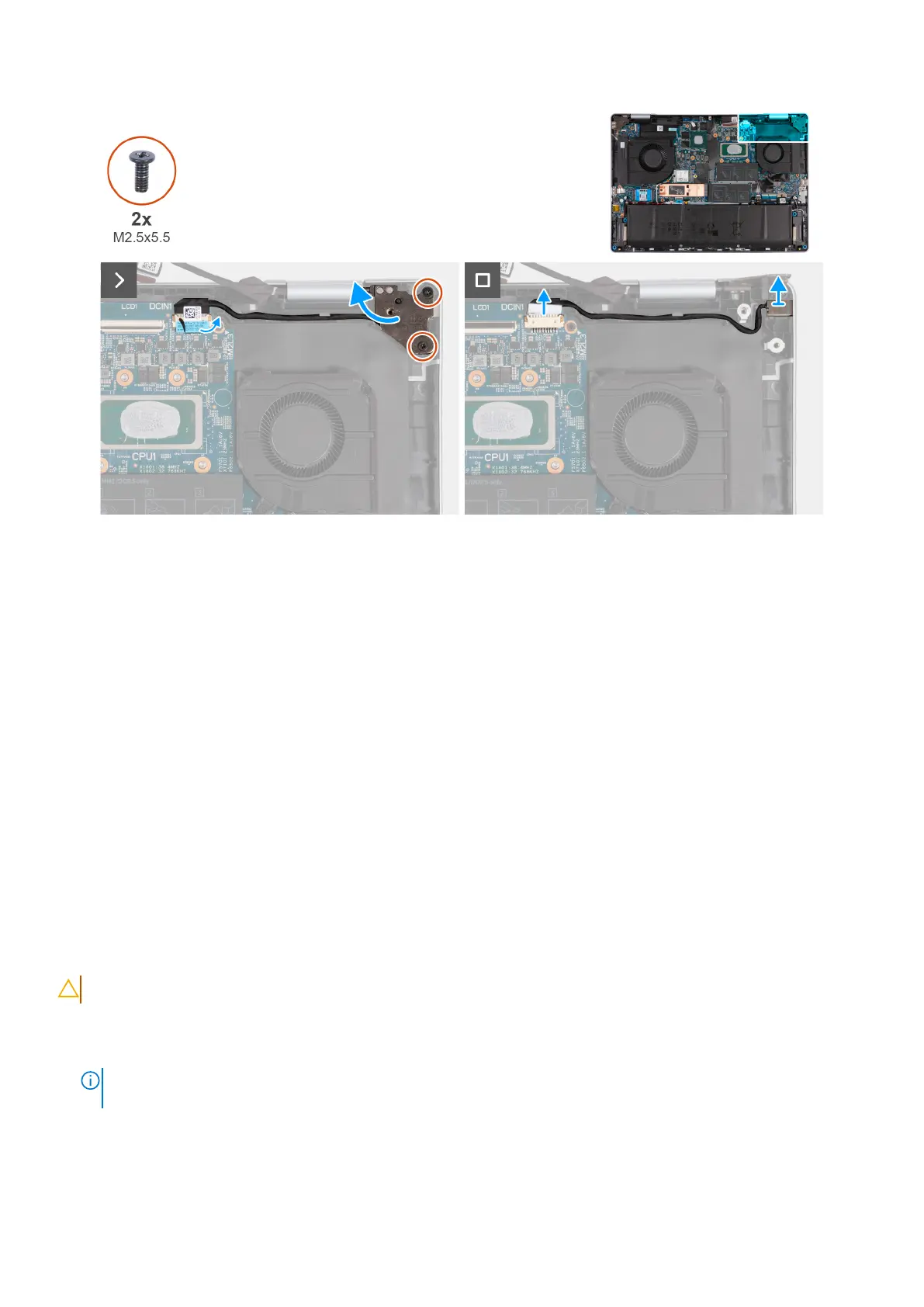6. Replace the two screws (M2.5x5.5) that secure the right-display assembly hinge to the system board.