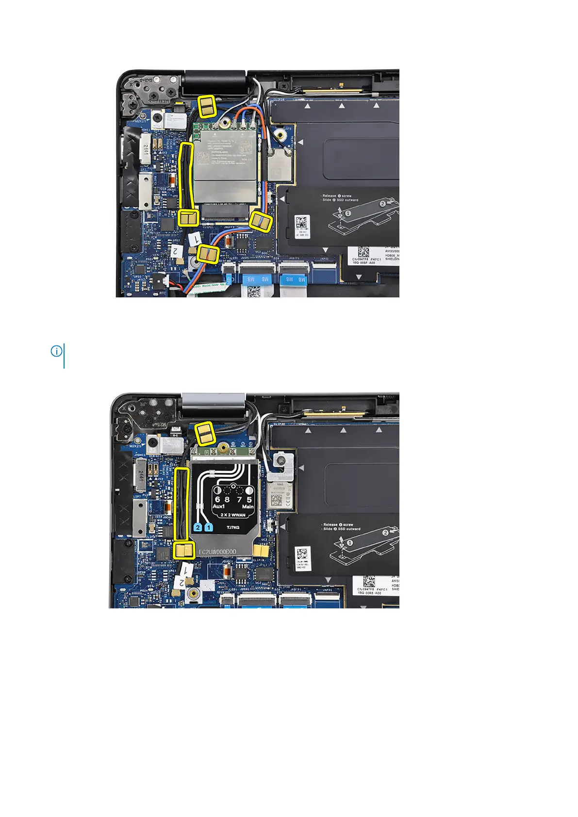 WWAN Aux1 antenna cable and #5 white/gray WWAN Main antenna cable through the respective routing guides on the