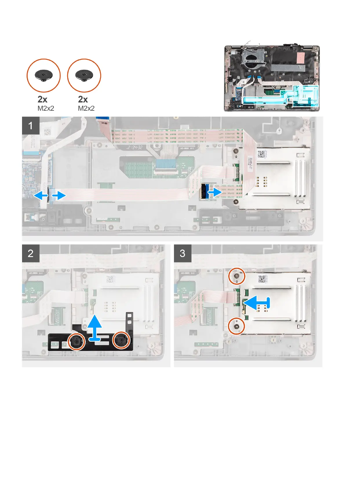 6. Remove the two (M2x2) screws that secure the smart card reader to the palm-rest assembly.