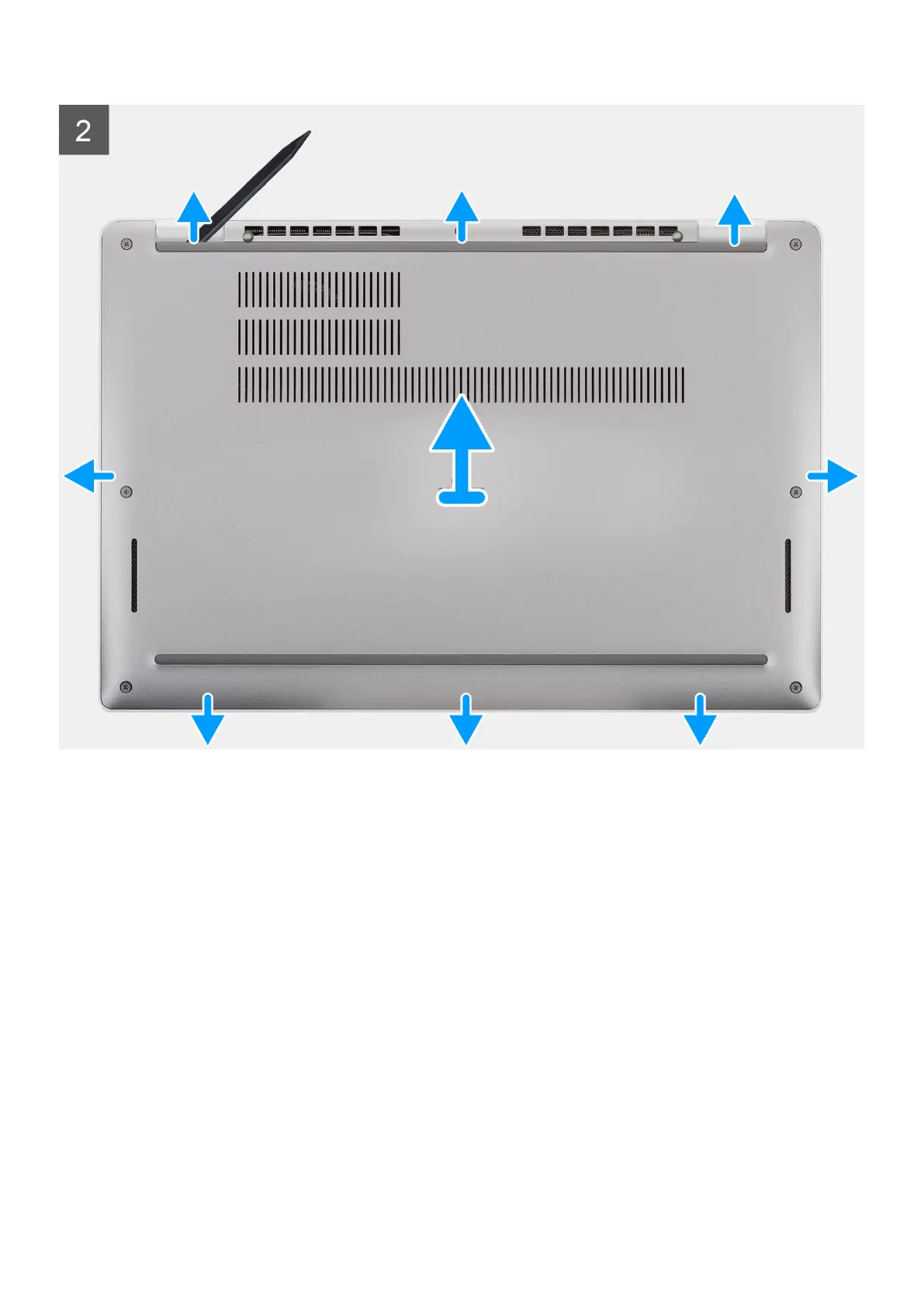 2. Using a plastic scribe, pry the base cover from the U-shaped indents at the top edge of the base cover and continue to work