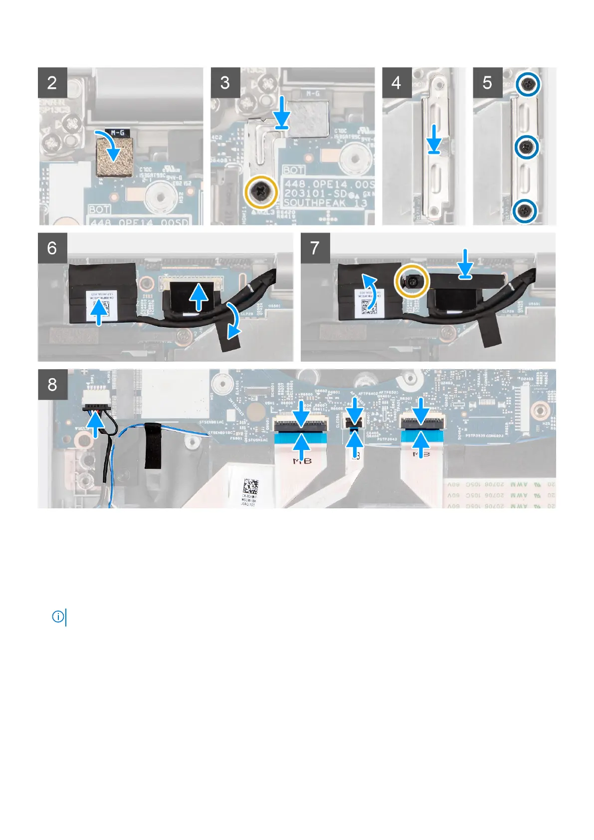 2. Replace the two (M2x3) screws, two (M2x2.5) screws, and (M2x4) screw to secure the system board to the palm-rest