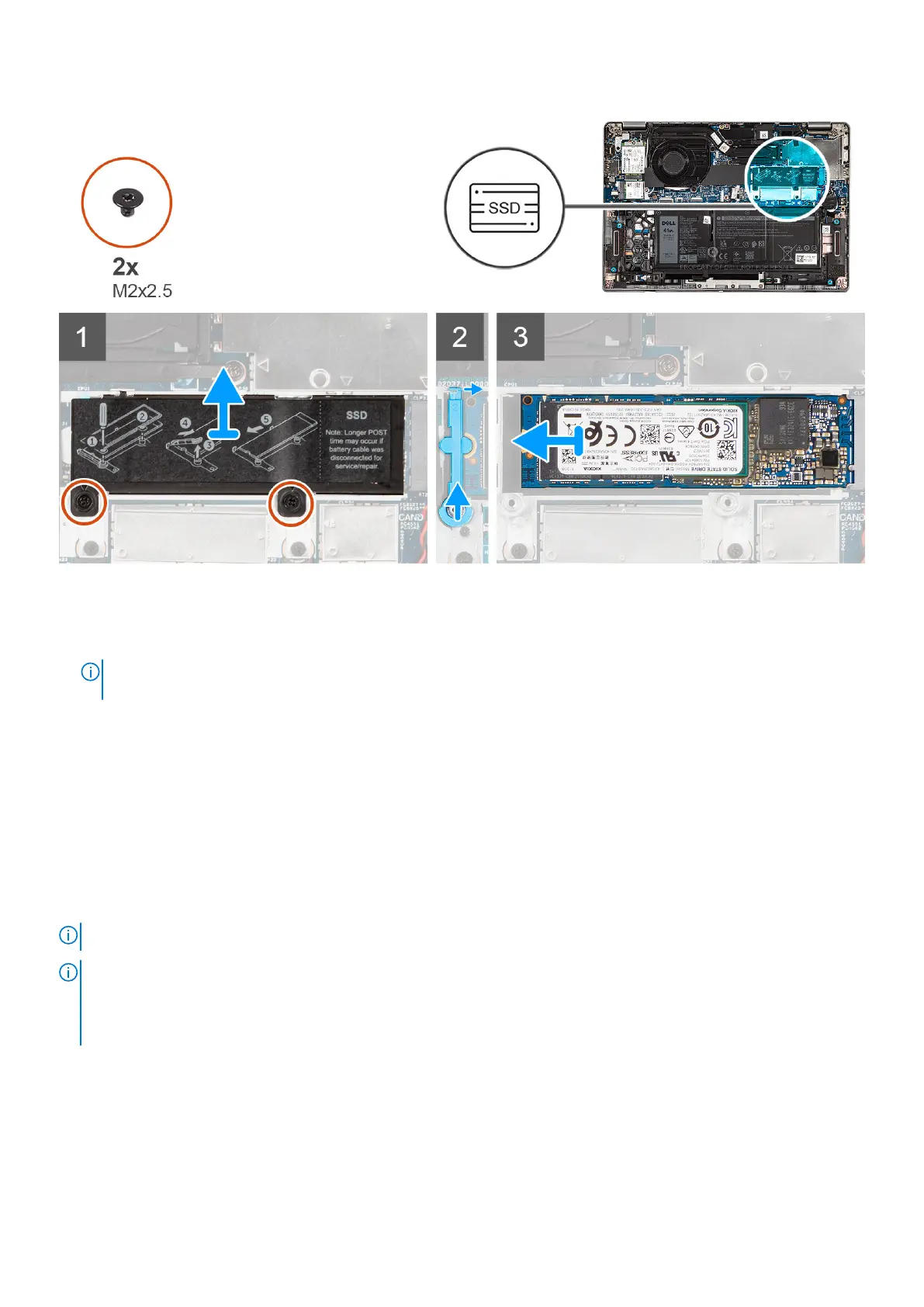 1. Remove the two (M2x2.5) screws that secure the solid-state drive thermal plate to the system board.
