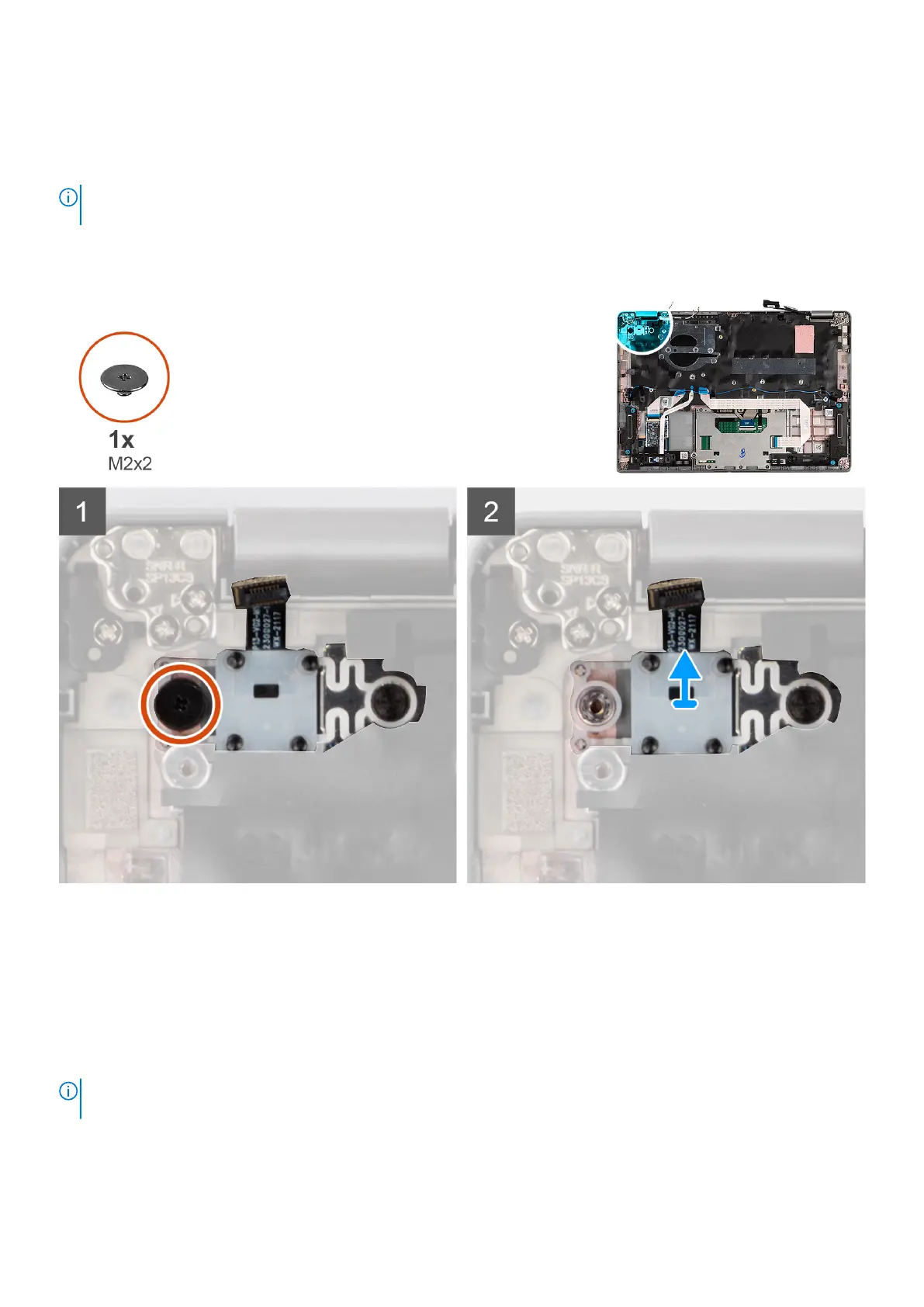 1. Remove the (M2x2) screw that secures the power button with optional fingerprint reader to the palm-rest assembly.