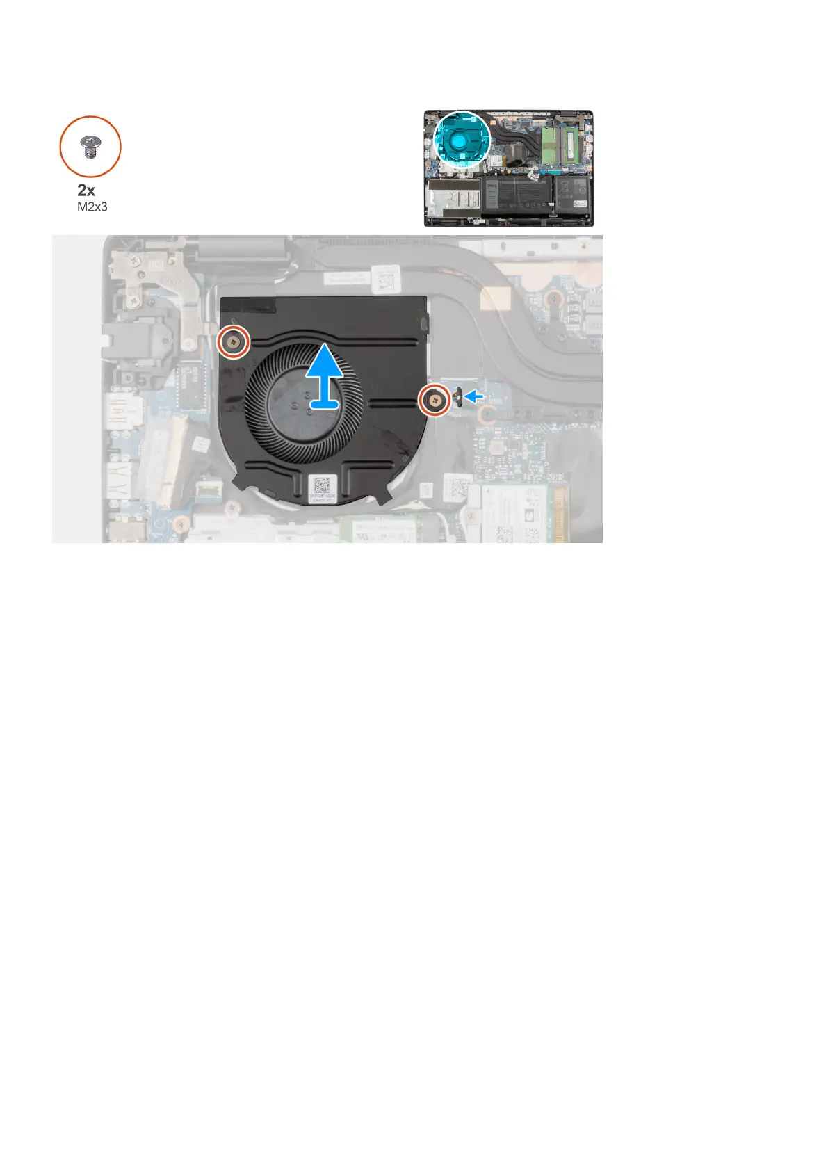 2. Remove the two (M2x3) screws that secure the system fan to the palmrest assembly.