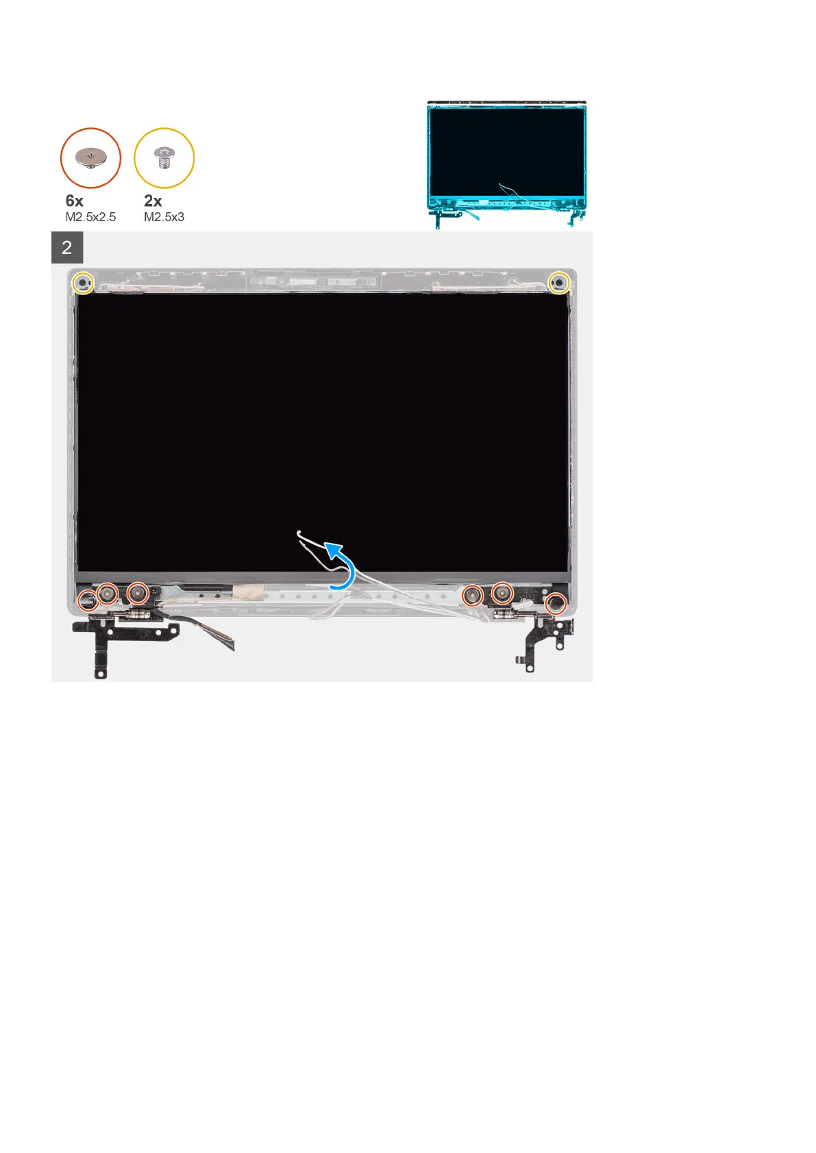 3. Install the six (M2.5x2.5) and two (M2.5x3) screws to secure the left and right hinge brackets in place.