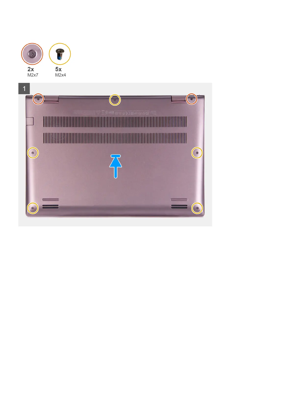 3. Replace the five screws (M2x4) that secure the base cover to the palm-rest assembly.