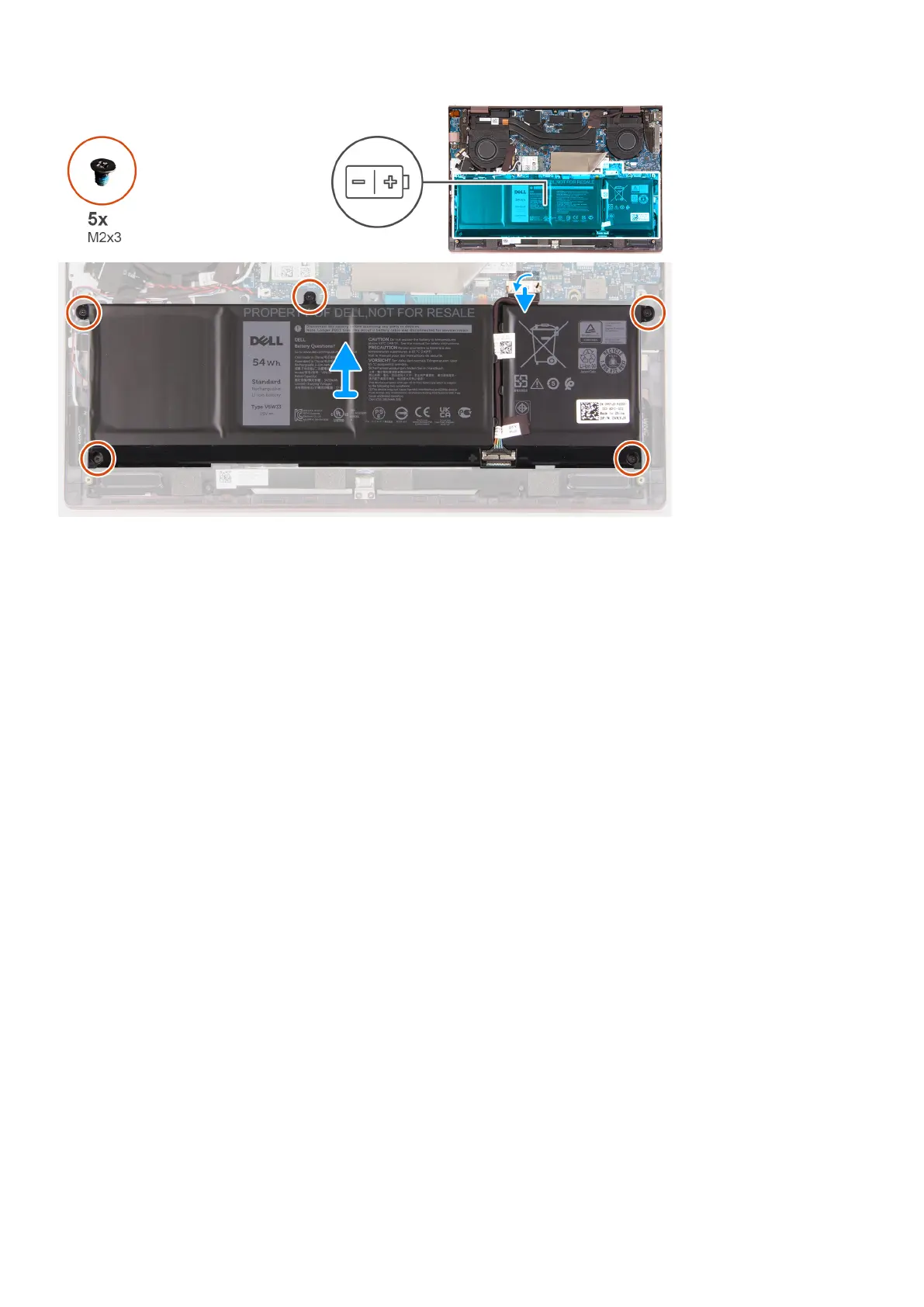1. Remove the five screws (M2x3) that secure the battery to the palm-rest and keyboard assembly.