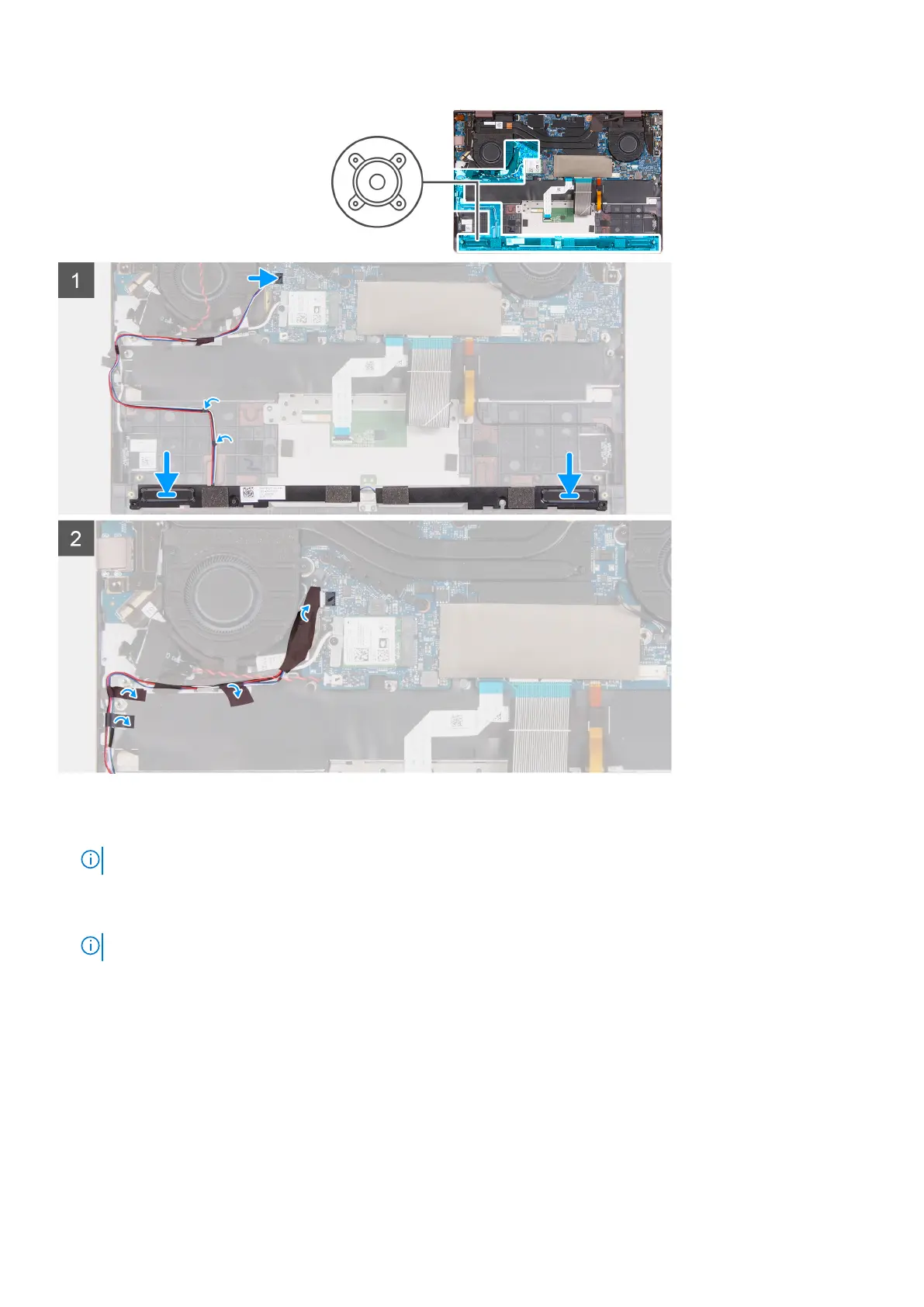2. Route the speaker cable through the routing guides on the palm-rest and keyboard assembly.