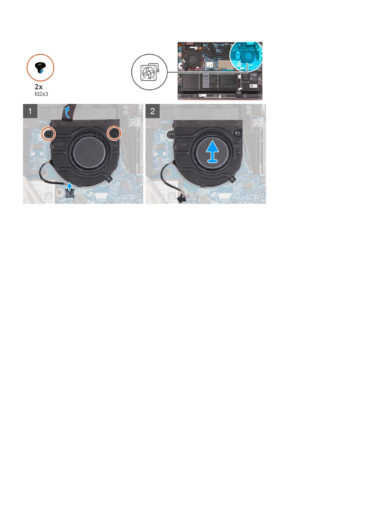 2. Remove the two screws (M2x3) that secure the right fan to the palm-rest and keyboard assembly.