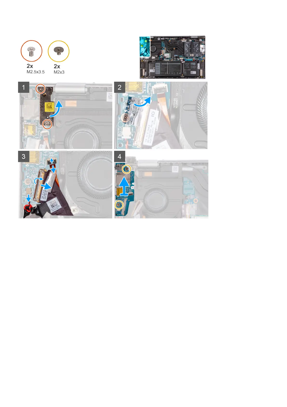 1. Remove the two screws (M2.5x3.5) that secure the right display hinge to the I/O board and palm-rest and keyboard