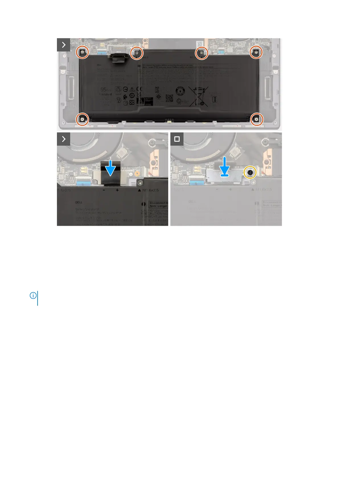 3. Replace the six screws (M1.6x2.5) to secure the battery to the palm-rest and keyboard assembly.