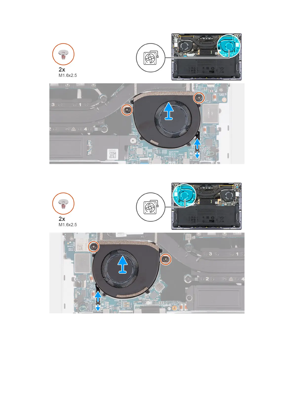 5. Remove the two screws (M1.6x2.5) that secure the right fan to the system board.