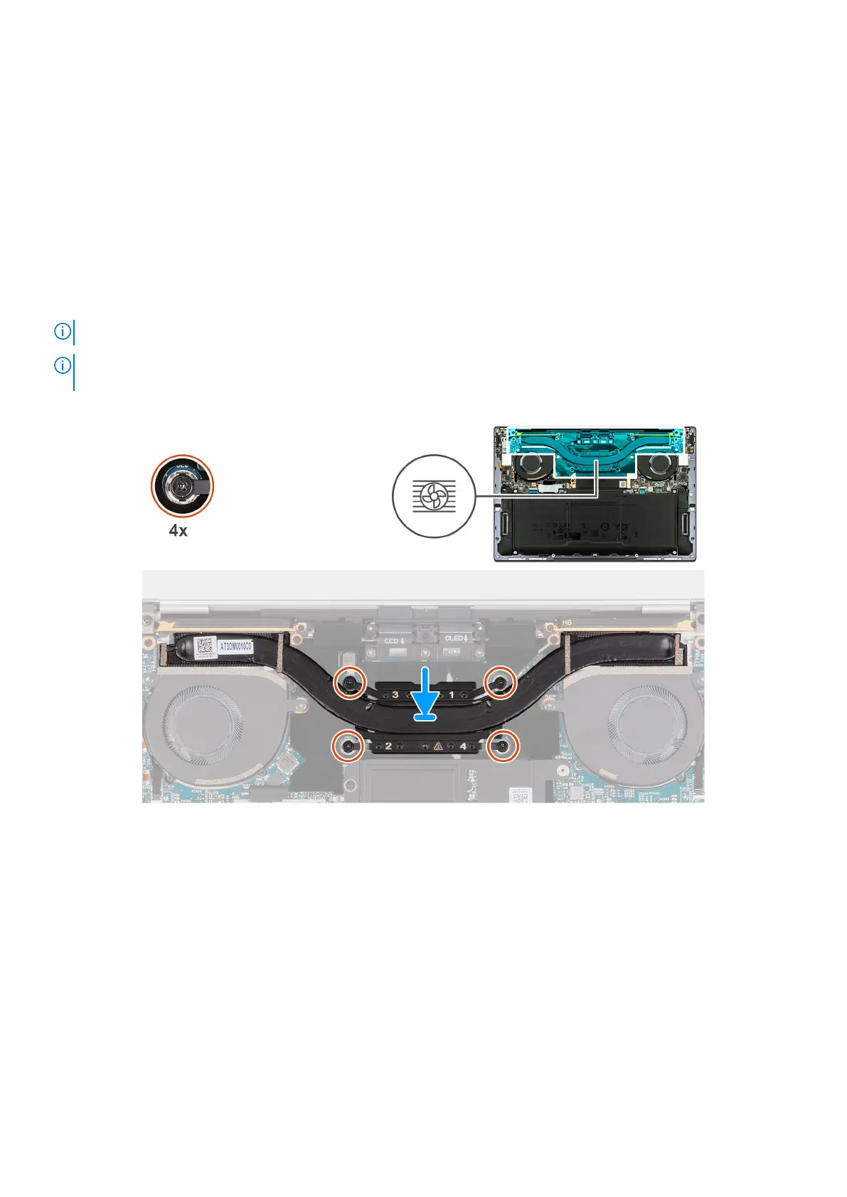 2. In sequential order (1>2>3>4) as indicated on the heat sink, tighten the four captive screws that secure the heat sink to the