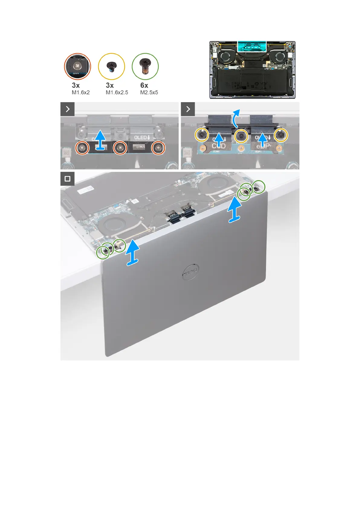 7. Remove the three screws (M2.5x5) that secure the right hinge to the system board and the palm-rest and keyboard