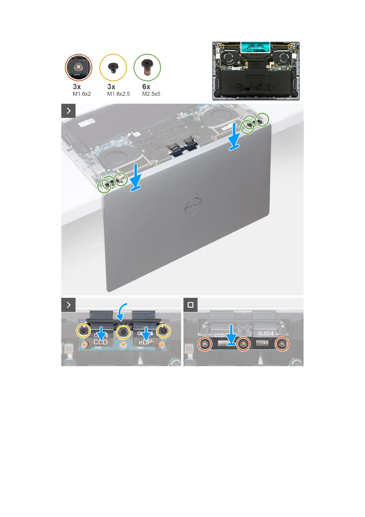 6. Replace the three screws (M2.5x5) to secure the right hinge to the palm-rest and keyboard assembly.