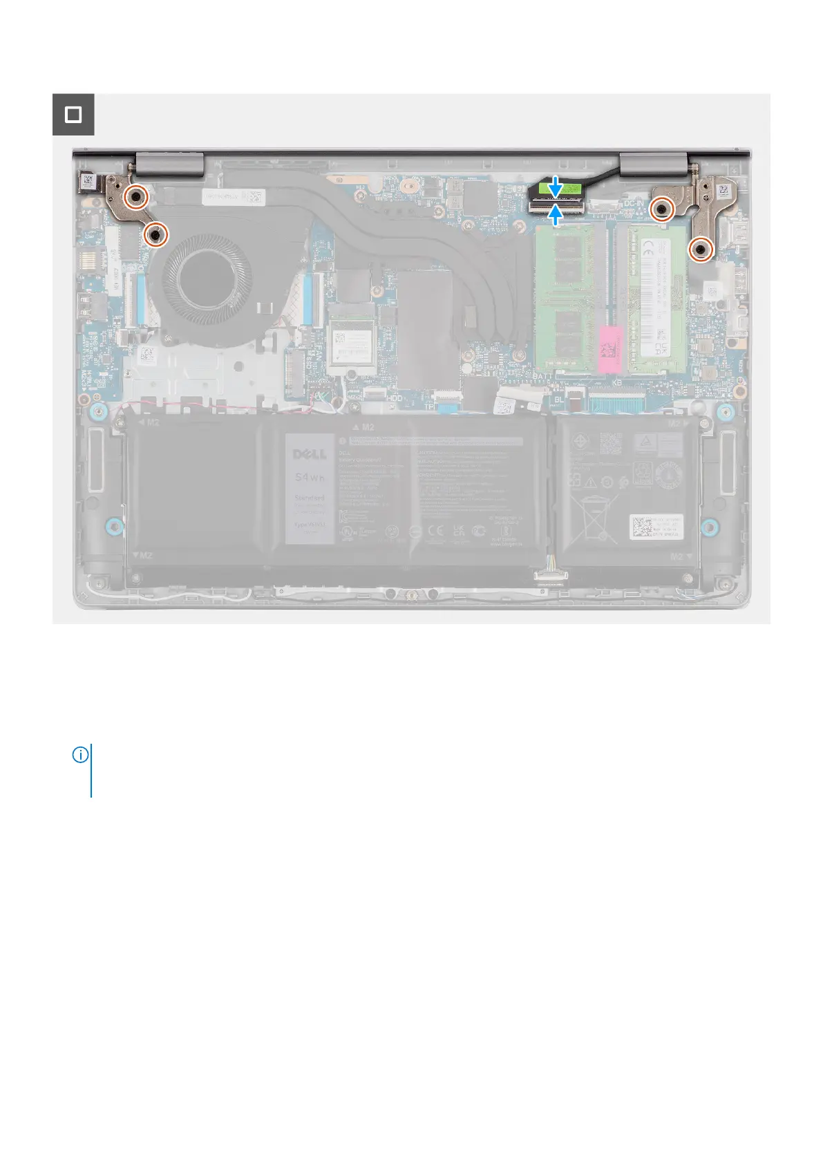 3. Replace the four (M2.5x5) screws that secure the display hinges to the palm-rest and keyboard assembly.